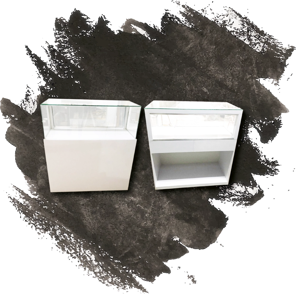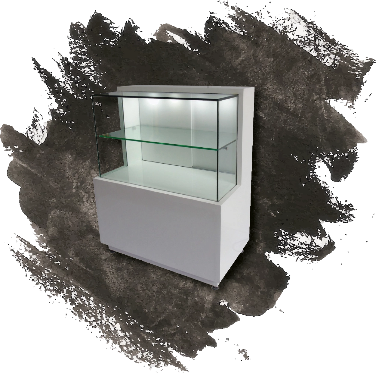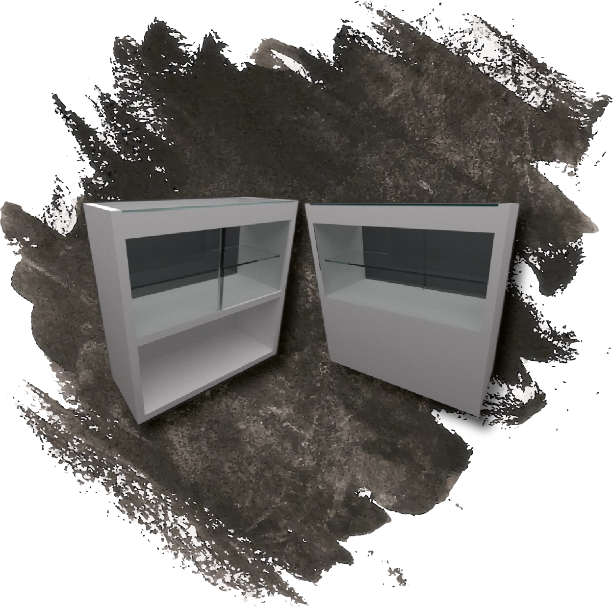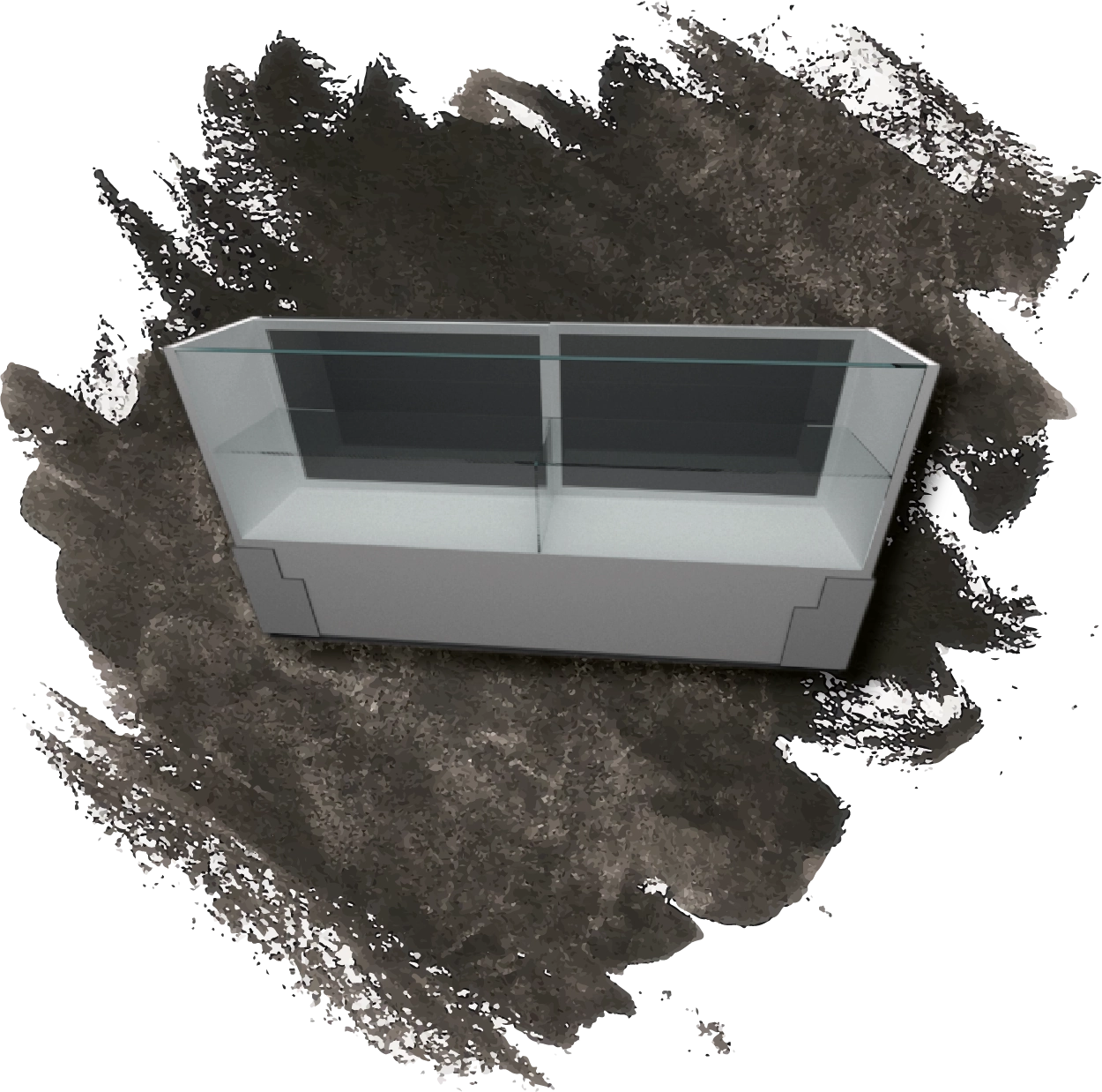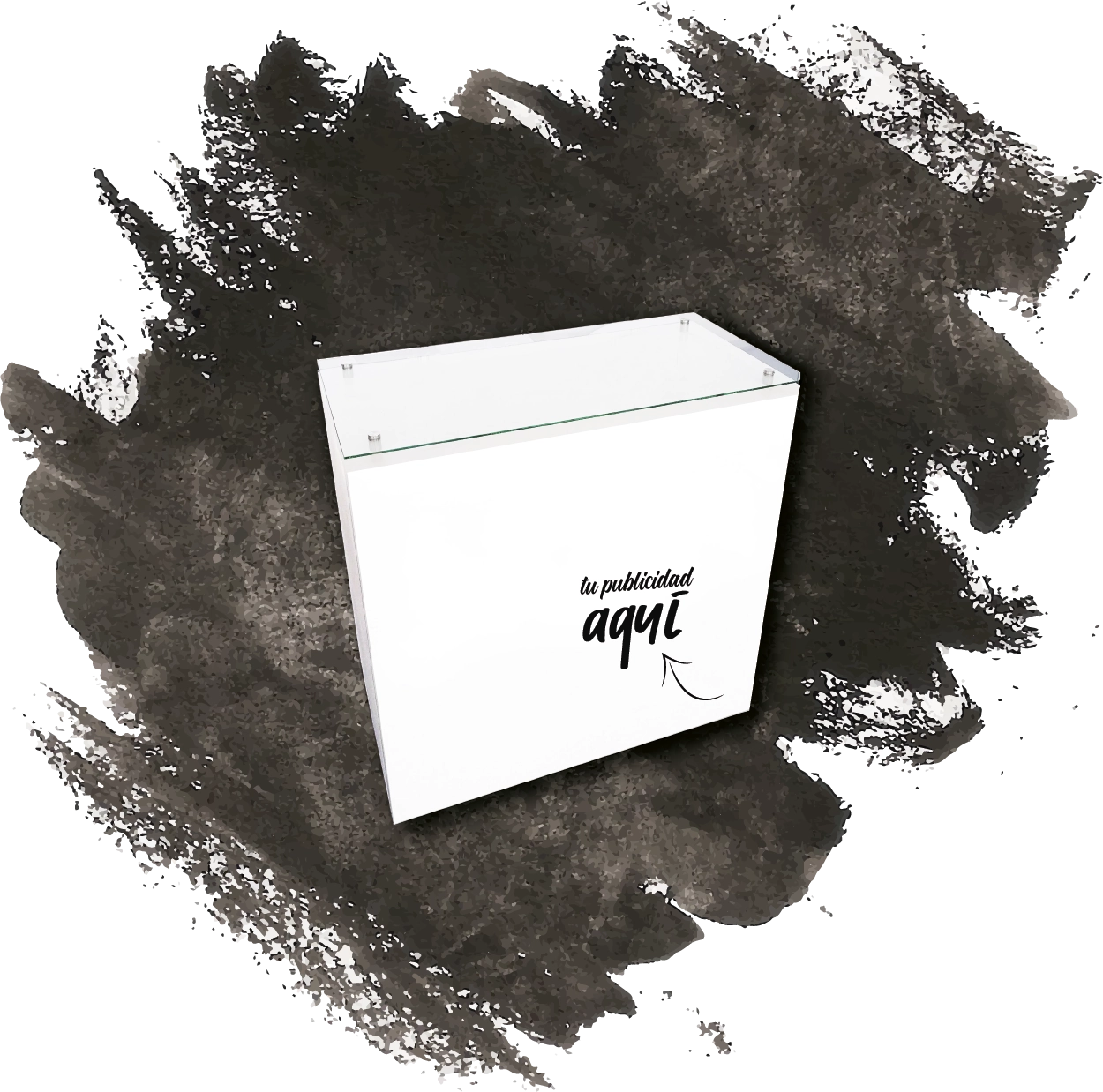Con superficie en vidrio y bodega de seguridad en la parte de atrás, con medidas de 1.20 x 1.05 mts y 50 cm de profundidad